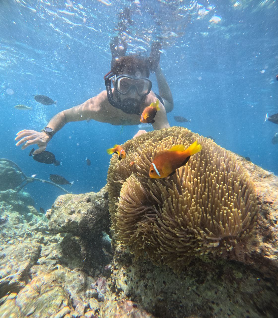 تور نیم روزی حدود ساعت 11 صبح تا 18، اسنورکلینگ در جزیره مرجانی و اسنورکلینگ با ماهی ها و همینطور شانس دیدن لاکپشت های بزرگ( اسنورکلینگ در سه نقطه مختلف)،سپس رفتن به جزیره محلی Gulhi و نهار ، امکان عکاسی روی تاب معروف داخل دریا ، دیدن غروب زیبا روی قایق در دریا و بازگشت به هتل. شب امکان رفتن به floating bar کنار جزیره.